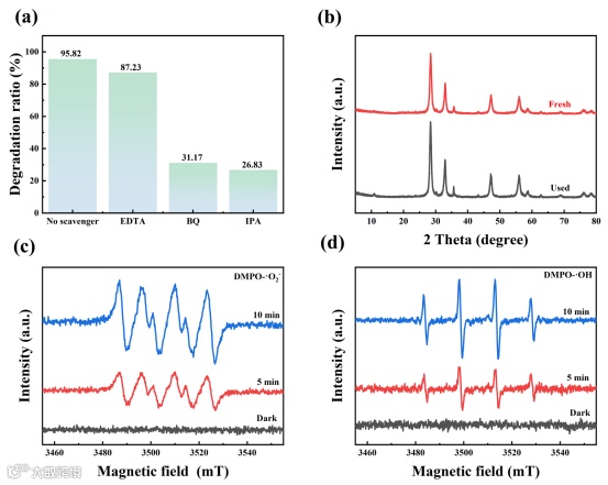 图3. (a)25%-MFO/BWO对TCH降解的去除率;(b)对重复降解实验前后XRD谱的比较;(c)和(d)25%-MFO/BWO复合材料的DMPO- · O2-和DMPO- · OH的 ESR光谱。