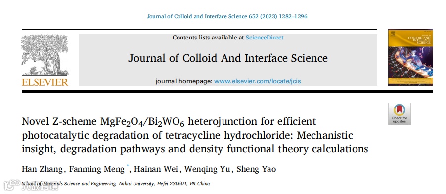 近日,来自安徽大学的孟凡明教授,在国际知名期刊Journal of Colloid And Interface Science上发表题为“Novel Z-scheme MgFe2O4/Bi2WO6 heterojunction for efficient photocatalytic degradation of tetracycline hydrochloride: Mechanistic insight, degradation pathways and density functional theory calculations”的观点文章。该观点通过采用湿法球磨工艺合成了具有优异光催化性能的复合材料,通过一系列表征测试证实了该光催化复合材料符合Z型光催化机制,合成的复合材料具有优良的微观形貌,且在重复实验中保持高稳定性。