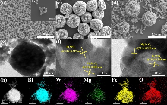 图2.(a)和(b)MgFe2O4在不同放大倍数下的SEM图像;(c)Bi2WO6的SEM图像;(d)和(e)MFO/BWO的SEM和TEM图像;(f)和(g)MFO/BWO在HRTEM下的图像;(h)MFO/BWO复合材料的元素映射图。