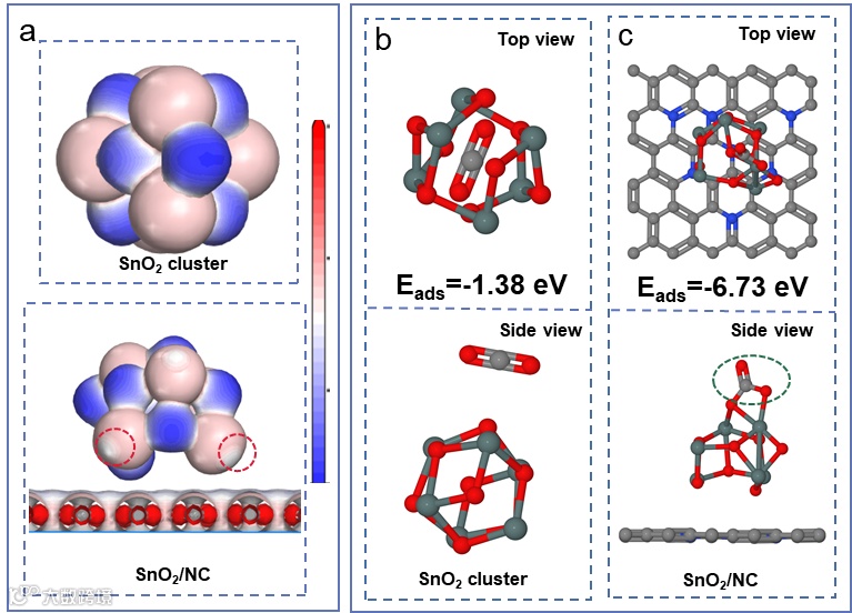 图3. (a)纯的SnO2团簇与SnO2/NC的表面静电势分布(颜色由蓝到红表示电荷由负到正),(b)SnO2团簇以及(c)SnO2/NC对CO2分子的吸附模型