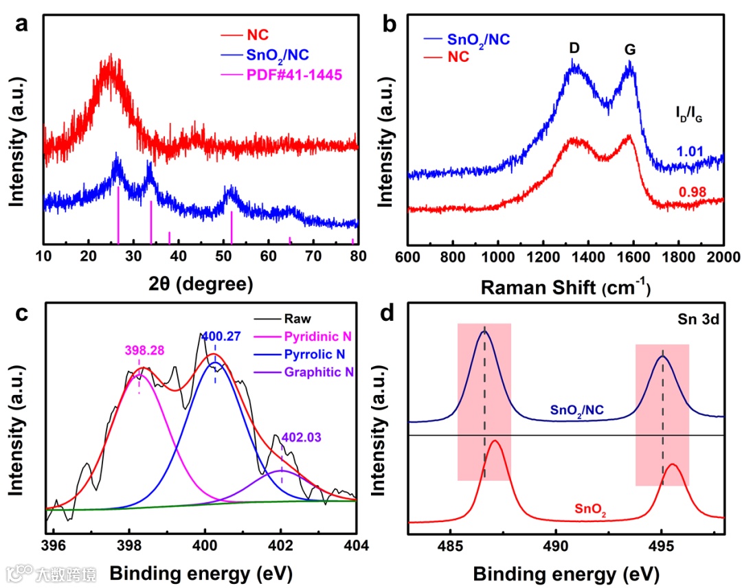 图2. (a)样品的XRD图谱和(b)Raman图谱,(c)SnO2/NC的N 1s高分辨XPS,(d)SnO2和SnO2/NC的Sn 3d的高分辨XPS