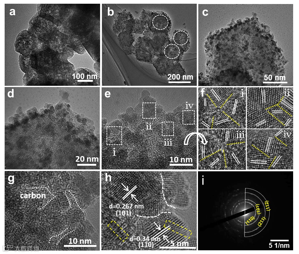 图4. 不同分辨率的(a)NC以及(b-d)SnO2/NC的TEM图片,(e)SnO2/NC的HRTEM图片,(f)图e中标识区域对应的局部放大图,(g, h)SnO2/NC的HRTEM,(i)SnO2/NC的选区电子衍射花样