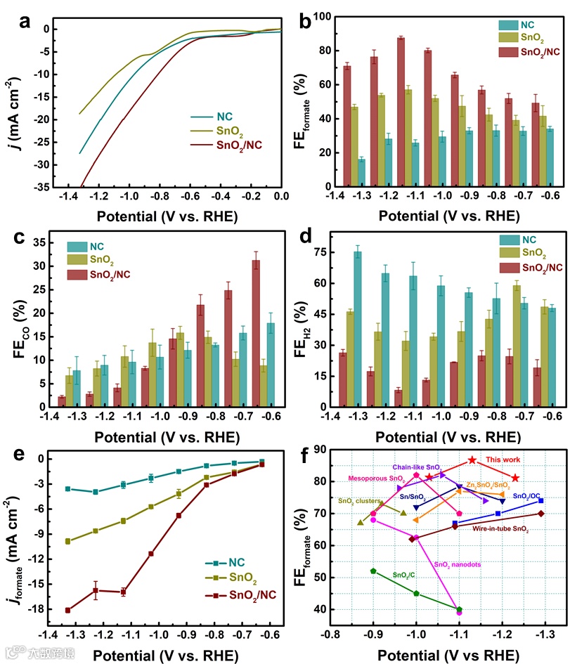 图5. (a)SnO2/NC, SnO2以及NC的LSV曲线,(b)FEformate,(c)FECO,(d)FEH2,(e)甲酸盐的部分电流密度以及(f)SnO2/NC电极产甲酸盐效率与最近报道的Sn基催化剂对比
