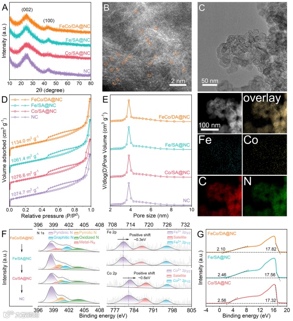 Figure 2. A) XRD patterns of all samples prepared. B) AC-TEM image with highlighted bimetallic Fe-Co sites, C) TEM image and elemental mapping images of FeCo/DA@NC. D) Nitrogen adsorption-desorption isotherms, E) Pore size distribution curves of all samples prepared. F) XPS survey spectra of N 1s, Fe 2p, and Co 2p of all samples prepared. G) UPS spectrum of FeCo/DA@NC, Fe/SA@NC, and Co/SA@NC.