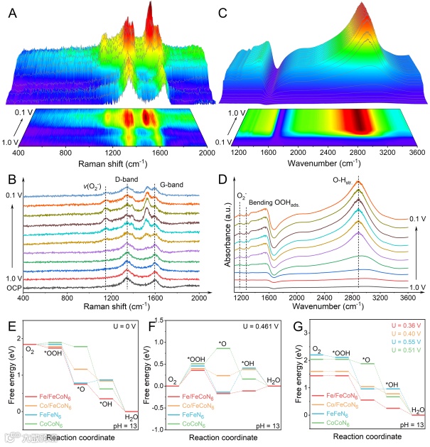 Figure 4. A, B) In-situ Raman spectra of FeCo/DA@NC catalyst in ORR process. C, D) In-situ FTIR spectra of FeCo/DA@NC catalyst in ORR process. Gibbs free energy plots of the ORR process for FeCoN6 (Fe site), FeCoN6 (Co site), FeFeN6, and CoCoN6 at E) 0 V, F) 0.461 V, and G) corresponding limit potential.