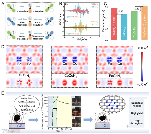 Figure 1. A) Schematic representation of the electroniccoupling between Fe and Co in FeCo/DA@NC. B) PDOS and corresponding d-band centers, C) Bader charge transfers for FeFeN6, FeCoN6 (Fe site), CoCoN6, and FeCoN6 (Co site). D) Charge density differences of FeFeN6, CoCoN6, and FeCoN6. E) The preparation of FeCo/DA@NC catalyst flow chart.