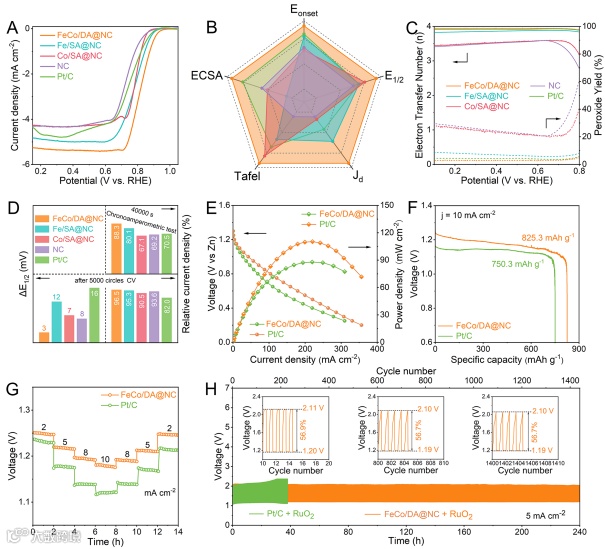 FeCo/DA@NC催化剂表现出优异的氧还原反应活性和稳定性,由该催化剂驱动的锌空气电池的功率密度和充放电循环也超过了由商业Pt/C催化剂构建的锌空气电池,表明FeCo/DA@NC催化剂具有替代贵重Pt基催化剂的潜力。