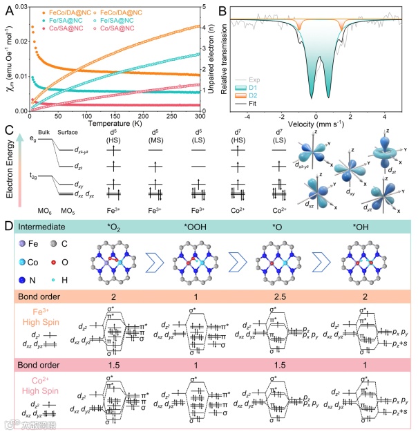 Figure 5. A) M-T curves and the calculated number of the unpaired electrons of FeCo/DA@NC, Fe/SA@NC, and Co/SA@NC. B) 57Fe Mössbauer spectroscopy of FeCo/DA@NC. C) Schematic diagram of energy level splitting from 6-coordinated (MO6) to 5-coordinatied (MO5), and d-electron configurations of iron and cobalt cations at the surface. D) Schematic diagram of the cascade mechanism of Fe sites and Co sites on FeCo/DA@NC, and the orbital interactions between metal site and the ORR intermediates.