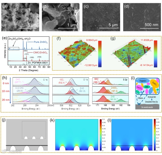图5. 锌沉积行为的研究. 不同电解质(a, b)不含CMC, (c, d)含CMC, (a, b)不含CMC, (c, d)在1 mA cm-2, 1 mA h cm-2下循环50次后,使用Zn//Zn电池的Zn金属阳极的SEM图像。(e)在1 mA cm−2和1mA h cm−2下循环100 h后Zn电极的XRD图谱。在ZnSO4电解质(f)和(g)中,锌阳极在1 mA cm-2、1 mA h cm-2下循环50次后的光学表面轮廓图。(h)在CMC/ZnSO4电解液中,以1 mA cm-2、1 mA h cm-2循环50次后,Zn金属表面C 1s、O 1s和S 2s的XPS深度分布图。(i) CMC/ZnSO4电解质的SEI结构示意图.有限元分析:(j)有CMC和无CMC体系的初始模型(插图),(k)纯ZnSO4电解质和(l) CMC/ZnSO4电解质中Zn沉积过程中Zn离子通量分布。