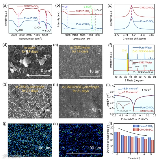 图1. 加/不加CMC时电解液的性质及锌金属的腐蚀行为。(a) 添加/不添加CMC的ZnSO4电解质的ATR-FTIR,(b) 拉曼和 (c) 核磁共振谱。锌板在 (d) 纯水和 (e) CMC/水中浸泡14天的SEM图像。(f) 锌板在含/不含CMC水中浸泡14天的相应XRD谱图。锌板在(g)纯ZnSO4和(h) CMC/ZnSO4电解质中浸泡21天的SEM图像。(i) 在含/不含CMC的ZnSO4电解质中,扫描速率为1 mV s−1的锌板的Tafel图。在(j) ZnSO4和 (k) CMC/ZnSO4电解液中,在1 mA cm-2和1 mA h cm-2下循环50次后,TOF-SIMS对锌板(ZnO+)的映射图像。(l)不同静置时间含/不含CMC的ZnSO4电解质在Zn板上的接触角。