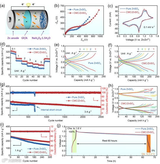 图6. Zn//NVO全电池的电化学性能.(a)CMC添加剂的全电池示意图。(b)循环前Zn//NVO全电池的EIS。(c)扫描速率为0.1 mV s−1时Zn//NVO全电池的CV曲线。(d)速率性能。在(e)ZnSO4和(f)CMC/ZnSO4电解质中在不同电流密度下的对应恒电流曲线。(g) Zn//NVO全电池在3 A g−1下的长期循环和(h)相应的恒电流曲线。(i)Zn//NVO全电池在1A g−1下的长期循环。(j)Zn//NVO全电池的自放电性能。