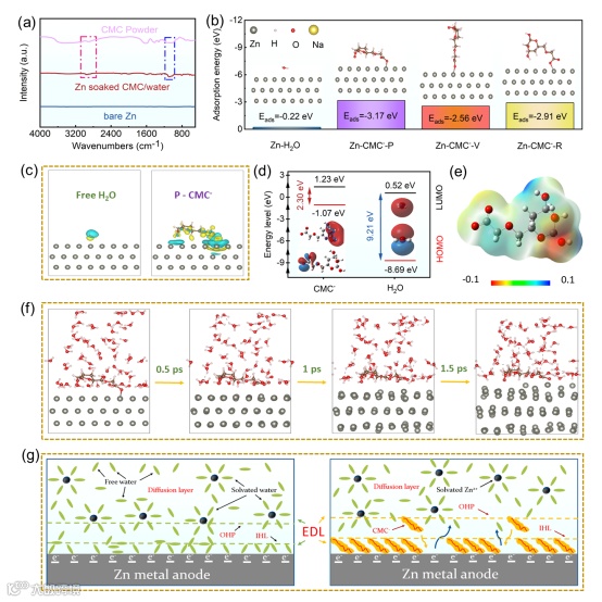 图2. CMC吸附锌金属的分析与理论模拟。(a)原始锌板、浸泡后锌板和CMC粉末的FTIR光谱。(b)不同状态(CMC-P(平行)、CMC-V(垂直)和CMC-R(平躺))的H2O和CMC-阴离子在Zn(002)表面的吸附模式和对应的吸附能。(c) Zn (002): H2O, CMC—P的电荷密度差。(d) CMC-和H2O的前沿分子轨道能。(e) CMC-的静电电位映射。(f) CMC-/Zn(002)在水环境中的模拟过程。(g)含/不含CMC电解质中EDL结构示意图。