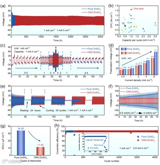 图4. 锌阳极在含/不含CMC电解质中的电化学性能。(a) 在1 mA cm−2和1 mA h cm−2下Zn//Zn对称电池的长循环性能。(b) 本工作与以往报告累积能力的比较。表S3列出了与点号对应的详细引用。(c) 在0.5 ~ 10 mA cm−2和1 mA h cm−2的电流密度下,Zn//Zn电池的速率性能。(d) 不同电流密度下的过电位。(e) 交替循环和静息过程中Zn//Zn电池的动态测量。(f) 电流密度逐步增加时Zn//Zn电池的电位演变。(g)锌阳极的EDL电容。(h) Zn//Cu半电池在1mA cm−2和0.5 mA h cm−2下的CE。