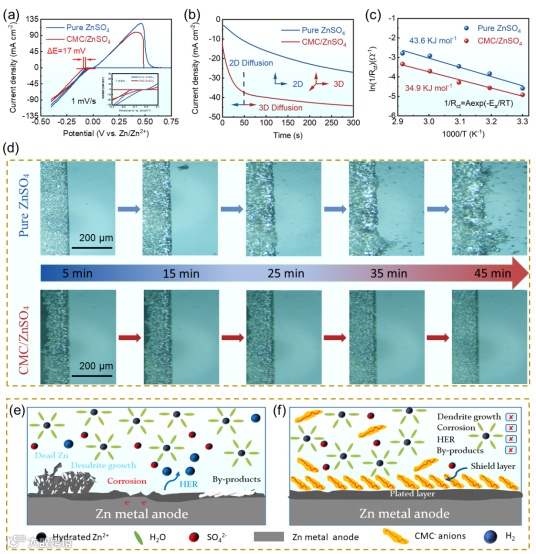图3. 锌沉积行为的研究。(a)扫描速率为1 mV s−1时,Zn//Ti电池在ZnSO4和CMC/ZnSO4电解质中的CV曲线。(b)在−150 mV的恒定电位下,在不同电解质中进行CA试验。(c)计算得到Zn2+在阳极/电解质界面扩散的活化能。(d)原位光学显微镜观察锌在两种电解质中的沉积:(上)ZnSO4,(下)CMC/ZnSO4。(e)锌沉积机理示意图。