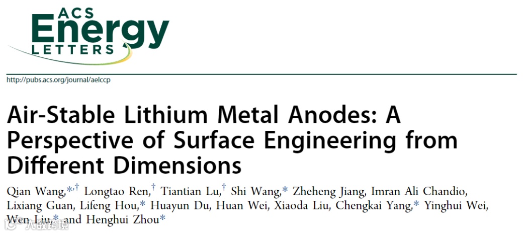 近日,来自太原理工大学的王骞副教授与北京化工大学的刘文教授合作,在国际知名期刊ACS Energy Letters上发表题为“Air-Stable Lithium Metal Anodes: A Perspective of Surface Engineering from Different Dimensions”的综述文章。该综述文章重点关注实现锂金属负极空气稳定性的现有挑战和进展。同时,总结了设计原理和基本要求,并尽可能从不同维度概述了与该领域相关的现有案例,希望以此为指导,为先进锂金属负极的制造提供全面的认识和可靠的方法。此外,还对空气稳定锂金属负极商业化的前景和未来机遇进行了批判性评估。