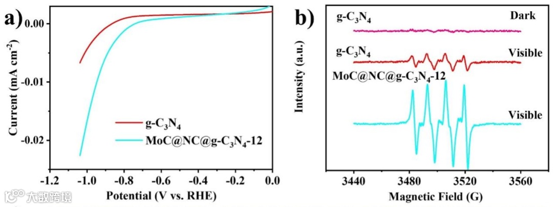 图8. g-C3N4和MoC@NC@g-C3N4-12的表征:a) 0.5 M Na2SO4溶液中的电催化HER极化曲线,b) DMPO−·O2−的EPR光谱。