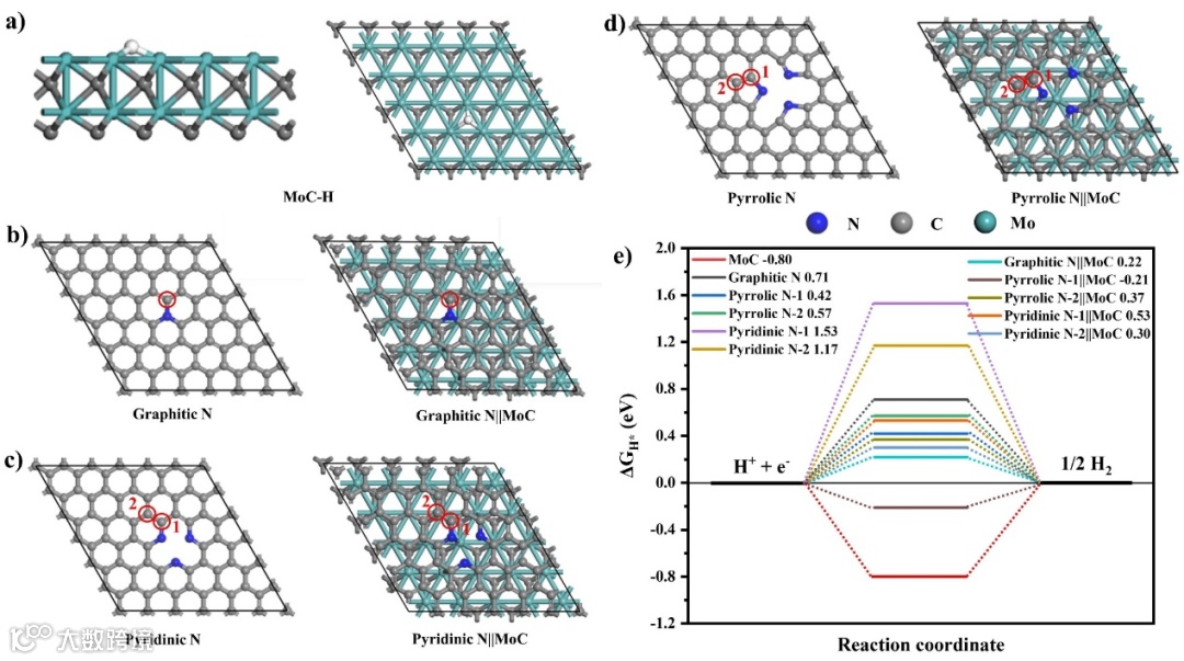 图4. a、b、c、d) N掺杂碳、MoC和MoC@NC的结构模型。e) N掺杂碳、MoC和MoC@NC的HER自由能图