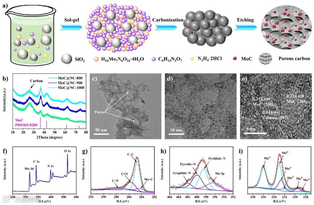 图2. a) MoC@NC催化剂的制备过程示意图。b) MoC@NC催化剂的XRD谱图。MoC@NC-900的c、d) TEM和e) HRTEM图像。f) MoC@NC-900的XPS全谱。MoC@NC-900的g) C 1s, h) N 1s, i) Mo 3d的高分辨率XPS光谱。