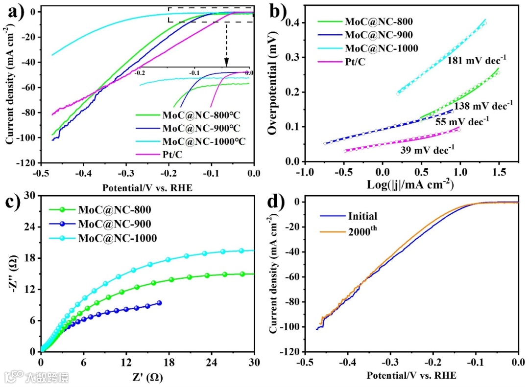 图3. a) MoC@NC催化剂的LSV曲线(图中插图为所选区域的放大视图),b)对应的Tafel图,c) Nyquist图。d) MoC@NC-900的循环稳定性