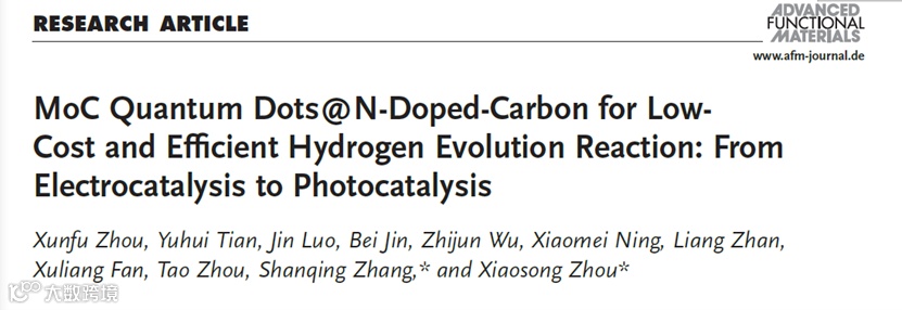 本文中,来自岭南师范学院的周小松教授与格里菲斯大学的张山青教授合作,在国际知名期刊Advanced Functional Materials上发表题为“MoC Quantum Dots@N-doped-carbon for Low-cost and Efficient Hydrogen Evolution Reaction: From Electrocatalysis to Photocatalysis”的研究文章。