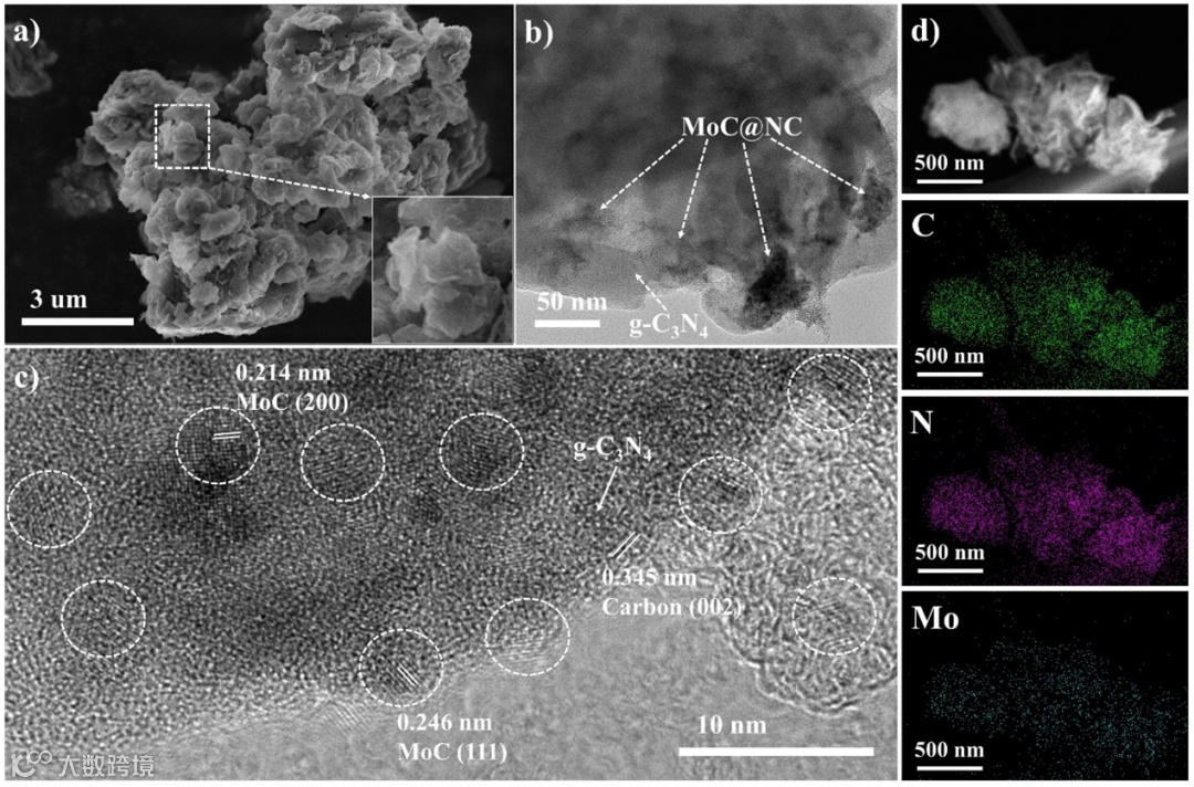 图5. MoC@NC@g-C3N4-12的表征:a) SEM, b) TEM, c) HRTEM, d) STEM,以及相应的C、Mo和N元素映射