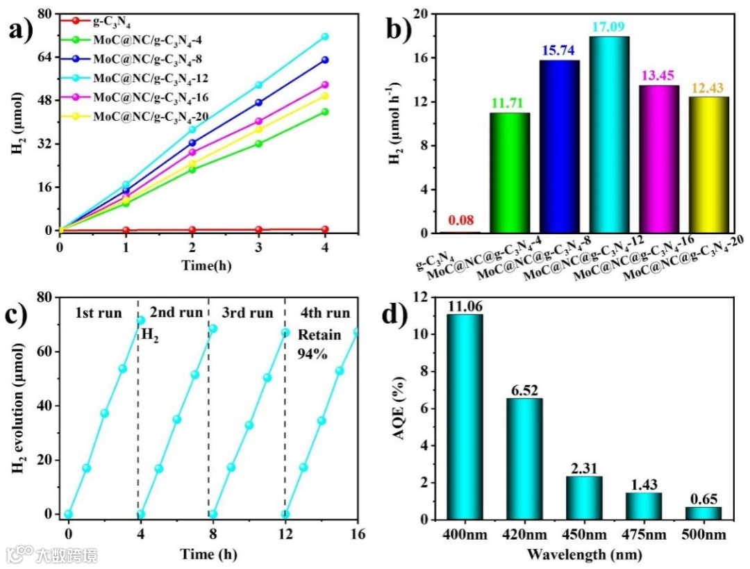 图6. a)不同光催化剂析氢的积累图,b)不同光催化剂析氢的平均速率。c) MoC@NC@g-C3N4-12的稳定性测试和d) AQE