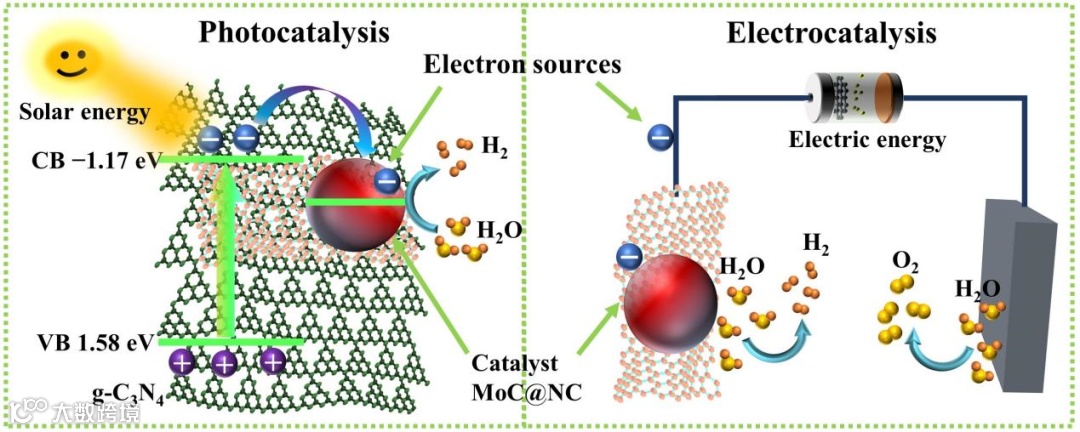 图1. MoC@NC在光催化析氢反应和电催化析氢反应中的作用示意图