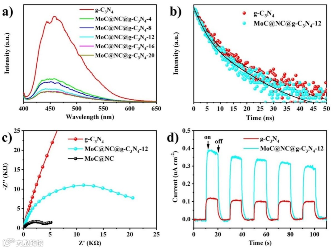 图7. g-C3N4, MoC@NC@g-C3N4和MoC@NC的表征:a)光致发光(PL)光谱,b)瞬态荧光光谱,c)电化学阻抗(EIS), d)瞬态光电流响应曲线