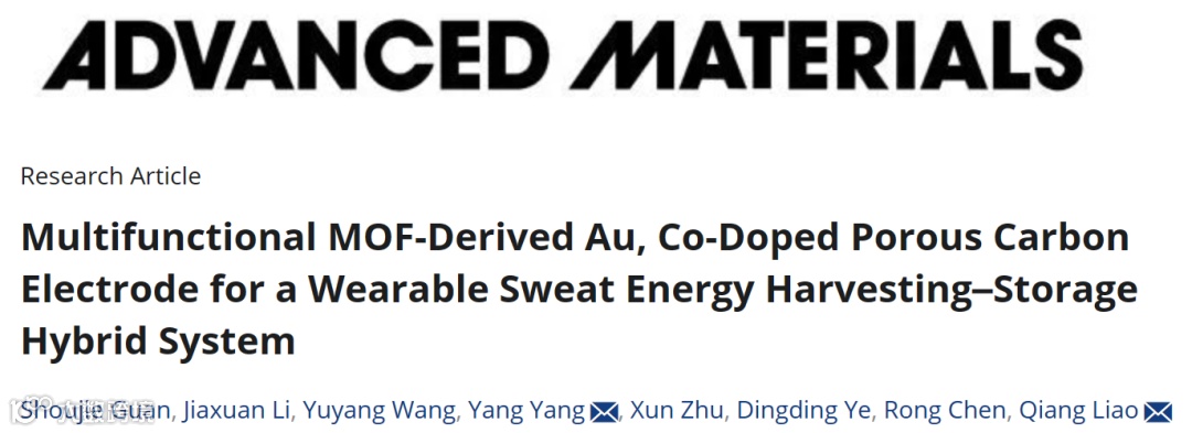近日,来自重庆大学能源与动力工程学院的杨扬副教授与廖强教授,在国际知名期刊Advanced Materials上发表题为“Multifunctional MOF-derived Au, Co-doped porous Carbon Electrode for Wearable Sweat Energy Harvesting-storage Hybrid System”的研究文章。该研究文章制备一个多功能电极,并设计了可穿戴能量收集-存储(超级电容器-生物燃料电池)微流控系统作为利用人体生物能量的装置(图1)。