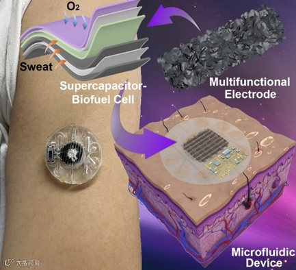 微型传感器等其他微电子技术的快速发展为可穿戴电源的研究开辟了新前景。柔性超级电容器-生物燃料电池(SC-BFC)由BFC能量收集模块和SC能量储存模块组成,是一种绿色环保的能量收集-储存混合设备。该设备使用BFC模块从佩戴者的汗水中收集生化能量,并将其存储在SC模块中以备后续使用。现有SC-BFC设备的SC的电极和BFC的酶载体采用不同的材料,使制备的成本和难度大大增加。并且,现有的可穿戴SC-BFC缺乏有效的汗液管理和电极保护措施,使设备的运行稳定性和寿命大大降低。本工作制备了一个多功能电极,并设计了可穿戴能量收集-存储(超级电容器-生物燃料电池)微流控系统作为利用人体生物能量的装置,证明了可穿戴汗液能量收集-存储混合微流控系统的广阔发展前景。