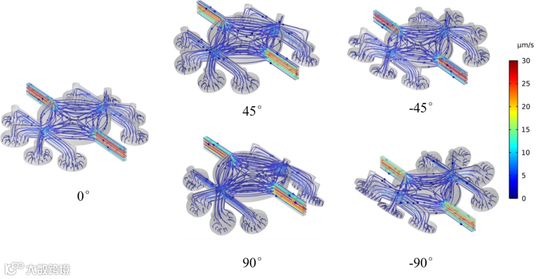 图3. 不同弯折工况下微流控系统内部的流场线。