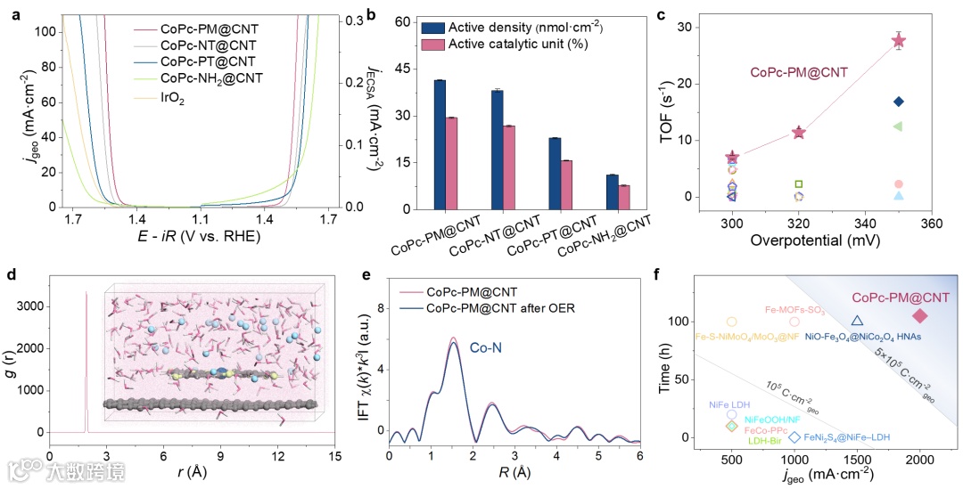 图3. 催化剂性能。a催化剂的极化曲线;b催化剂的活性密度和活性催化比率;c催化剂的表观活化能与活性密度关系;d Co周围配位N原子的径向分布函数;e CoPc-PM@CNT OER反应前后Co的FT-EXAFS;f催化剂的稳定性比较。