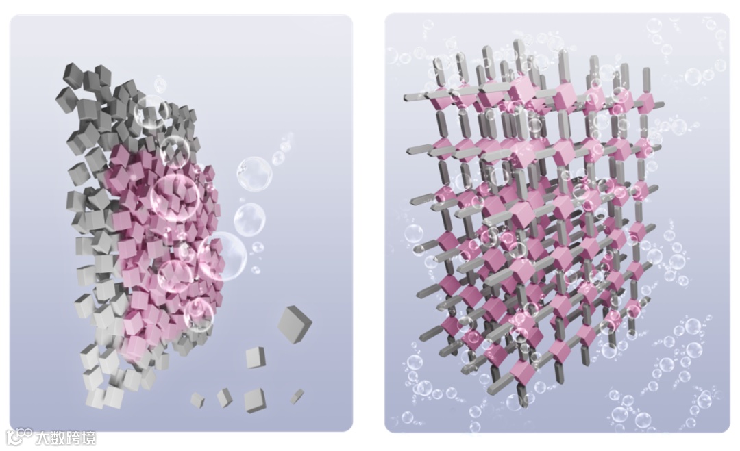 图2. 催化剂模型图。无序重叠的金属位点(左)和分子间隔的有序金属位点(右)。灰色和红色方块分别代表非活性中心和活性中心。
