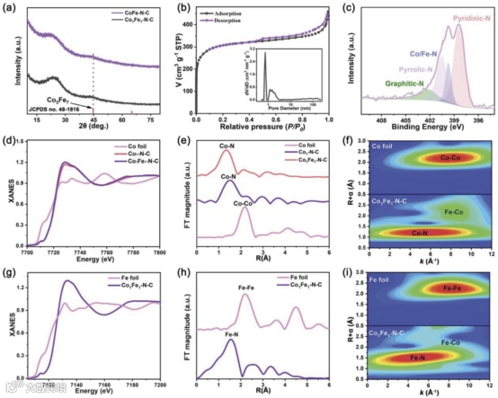 图3. Co1Fe1-N-C NRs的组成、价态和原子结构。(a)XRD图谱;(b)N2吸附/解吸曲线和相应的孔径分布(插图);(c)Co1Fe1-N-c的N1s XPS光谱;Co1Fe1-N-c和Co1-N-C的(d,g)XANES光谱,(e,h)傅里叶变换EXAFS,(f,i)小波变换(WT)。