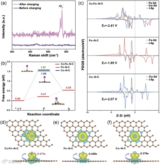 图5. 基于Co1Fe1-N-C的IOR工艺机理研究。(a)充电前和充电后的拉曼光谱;(b)插入吉布斯自由能和吸附构型图。棕色、橙色、蓝色和紫色球体分别表示C、Fe、Co和I原子;Co1Fe1-N-C、Fe1-N-C和Co1-N-C的(c)投影态密度(PDOS)和(d-f)电荷密度差。黄色的云表示电荷积累,蓝色区域表示电荷耗尽。
