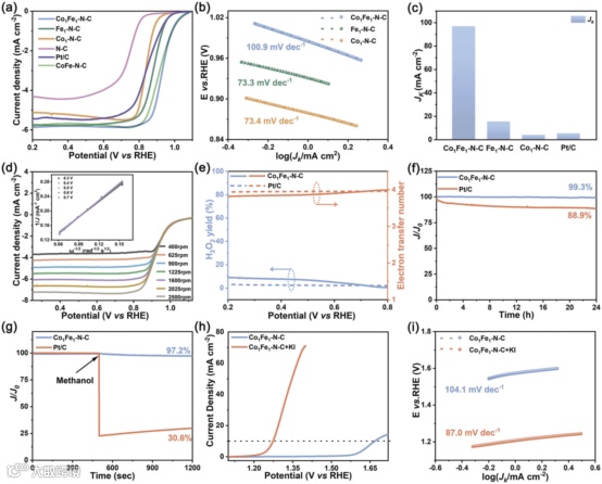 图4. ORR和IOR性能。(a)ORR的LSV曲线和(b)在O2饱和的0.1M KOH溶液中在1600rpm转速下的相应Tafel斜率;(c)0.85 V时JK的直方图;(d)Co1Fe1-N-C在0.1M KOH溶液中不同转速下的LSV曲线和在不同电势下的K-L拟合线;(e)Co1Fe1-N-C和Pt/C的H2O2产率(黑色)和电子转移数(红色);(f)ORR的计时电流曲线;(g)Co1Fe1-N-C和Pt/C的甲醇电阻计时电流测试;具有或不具有KI的Co1Fe1-N-C的(h)OER的LSV曲线和(i)相应Tafel曲线。