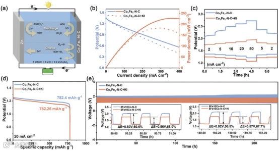 图6. 以KI为反应介质和不以KI作为反应介质的Co1Fe1-N-C NRs基锌-空气电池的电化学性能比较。(a)具有KI改性剂的锌-空气电池示意图;电池(b)放电极化曲线和相应的功率密度图,(c)从2到50mA cm-2速率性能,(d)在20mA cm-2下的放电曲线,(e)在2mA cm-2下的循环稳定性。