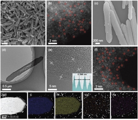 图2. Co1-N-C和Co1Fe1-N-C纳米棒的微观结构表征。(a)Co1-N-C纳米棒的SEM图像和(b)像差校正的HAADF-STEM图像,红色圆圈表示分离的Co原子;(c)Co1Fe1-N-C纳米棒的SEM图像、(d,e)TEM图像和(f)像差校正的HAADF-STEM图像,红圈表示分离的Co/Fe原子;(f)HAADF-STEM图像和相应的元素映射图像。