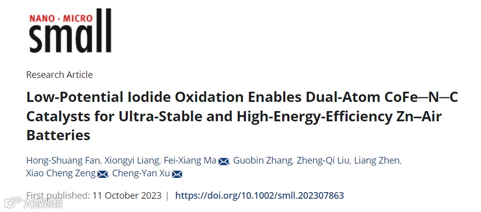 近日,来自哈尔滨工业大学(深圳)的徐成彦教授与香港城市大学的曾晓成教授合作,在国际知名期刊Small上发表题为“Low-Potential Iodide Oxidation Enables Dual-Atom CoFe-N-C Catalysts for Ultra-Stable and High-Energy-Efficiency Zn-Air Batteries”的观点文章。该观点文章提出了将ZIF衍生策略与后续热固定处理相结合,制备含有Co/Fe位点原子分散的双金属CoFe-N-C纳米棒(Co1Fe1-NC-NRs),研究发现这种双原子催化剂具有较优异的氧还原和碘氧化双功能活性,其中单原子催化剂的碘氧化(IOR)活性为首次报道。在常规ZAB中通过引入低电位IOR来替代充电过程中的OER过程,可以同时提高了ZABs的能量效率和可循环性。