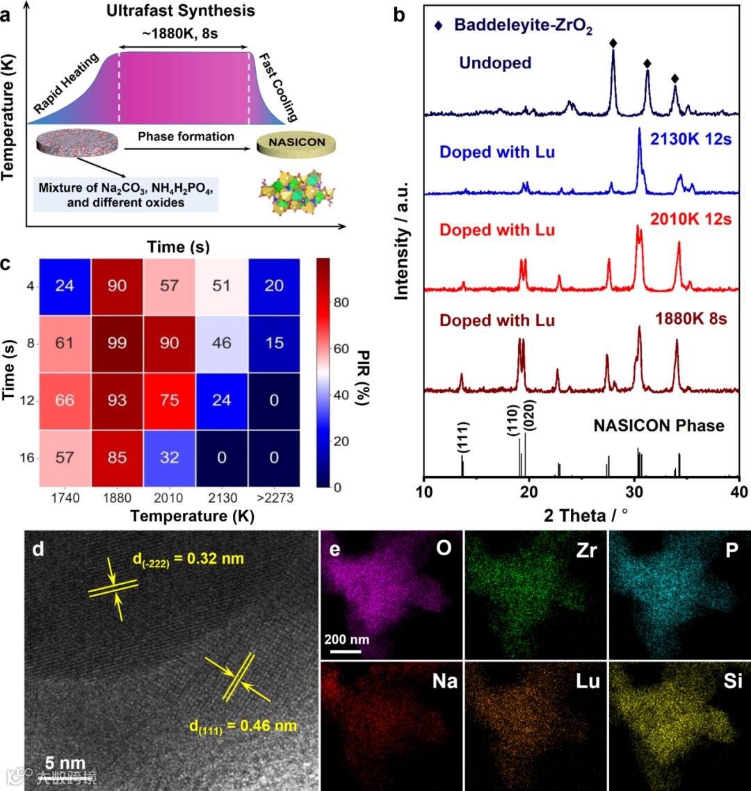 图1 NASICON型固态电解质的超快合成。a. 超快合成过程中的升降温曲线。b. 不同快烧条件下掺Lu前后的样品XRD。c. 超快合成中NASICON相形成的关键参数(时间和温度)选择。d. 掺Lu固态电解质的HRTEM。e. 掺Lu固态电解质的元素面分布图。