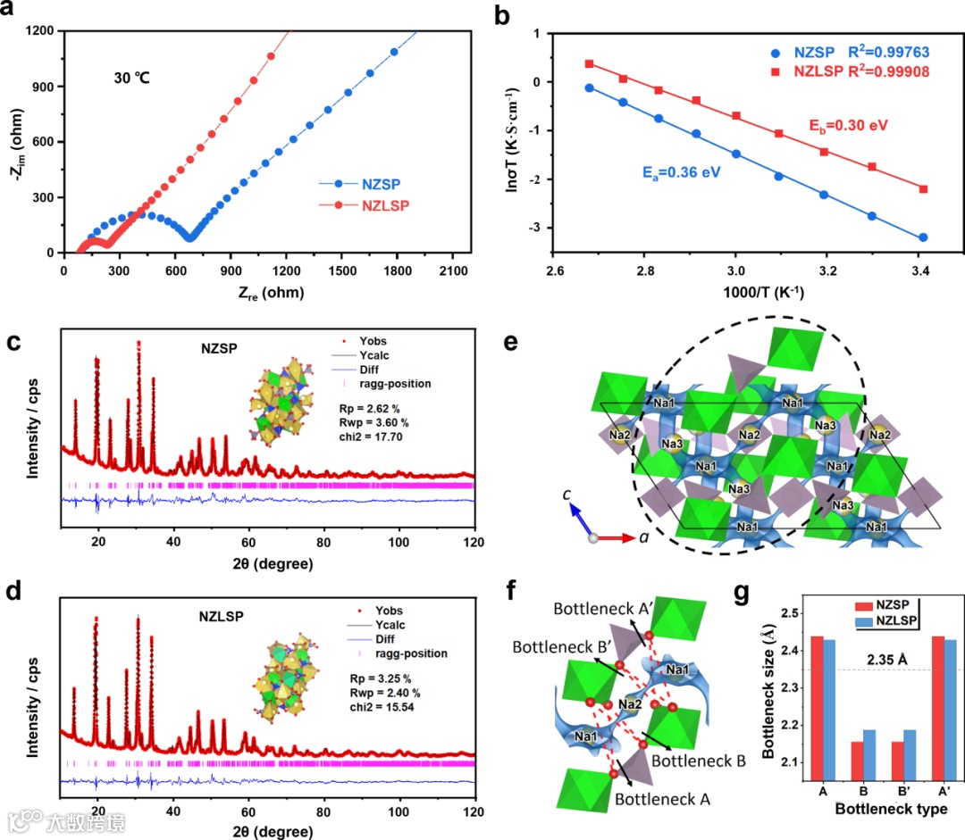 图4 NASICON型固态电解质的离子导电性能。a. 掺Lu前后固态电解质的阻抗。b. 掺Lu前后固态电解质的Arrhenius图。c, d. 掺Lu前后固态电解质的精修XRD。e-g. 掺Lu固态电解质的瓶颈计算。