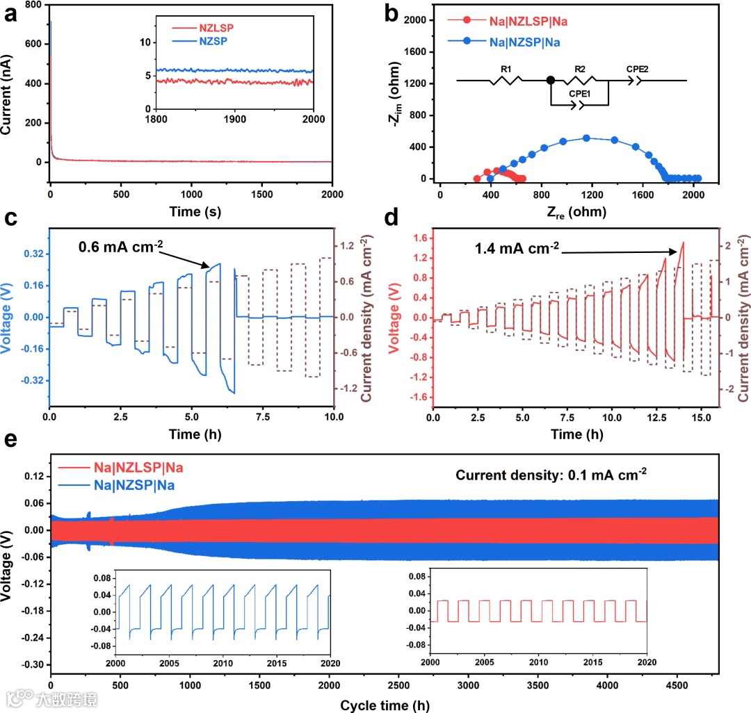图5中研究者测试了掺Lu前后NASICON固态电解质的电化学性能。其中,掺Lu NASICON固态电解质具有较低的界面阻抗和较高的电子电导。同时,其钠对称电池表现出高达1.4 mA cm-2的临界电流密度和4800小时以上的稳定循环。