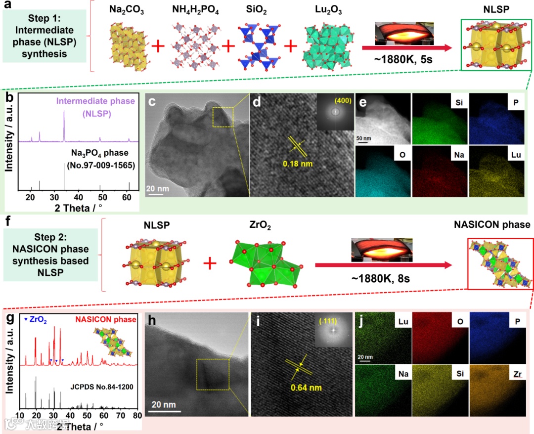 相比于传统合成陶瓷材料的方法,由马里兰大学胡良兵教授课题组发明的超快高温烧结技术(Ultrafast High-Temperature Sintering, UHS)可在数秒内制备结构致密、性能优良的陶瓷材料,因而受到了广泛的关注。尽管UHS方法已经成功地用于合成石榴石结构的锂氧化物固态电解质,但关于其他高性能的功能型复杂氧化物的超快合成还鲜有报道。在此研究基础上,对于NASICON型钠氧化物固态电解质来说,后续的研究者大都只报道了由预先合成的Na3Zr2Si2PO12 (NZSP)粉末的快速烧结成陶瓷片,而不是由前驱体直接合成NZSP相。这可能是由于固相合成的复杂性,其涉及复合前驱体的混合、加热、多步反应和煅烧等多步骤过程。在目标产物为复杂氧化物如NZSP的情况下,这些步骤对最终产物的形成至关重要,而由于复杂氧化物固相反应尚无明确的合成准则,其反应途径和机理尚不清楚,且快速反应过程是一个非平衡态热力学状态,反应更加难以捉摸。因此,用UHS技术制备NASICON固态电解质是一项重大的研究挑战。