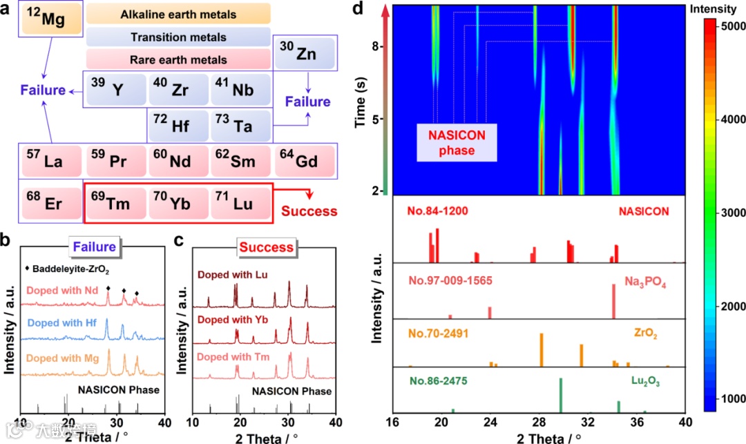 图2 常见不同掺杂体系NASICON型固态电解质的超快合成。a. 掺杂的不同元素。b. 合成的NayZr2-xMxSi2PO12(M=Nd、Hf和Mg)的XRD图。c. 合成的NayZr2-xMxSi2PO12(M=Lu、Yb和Tm)的XRD图。d. 在不同合成时间下捕获的样品的非原位XRD。