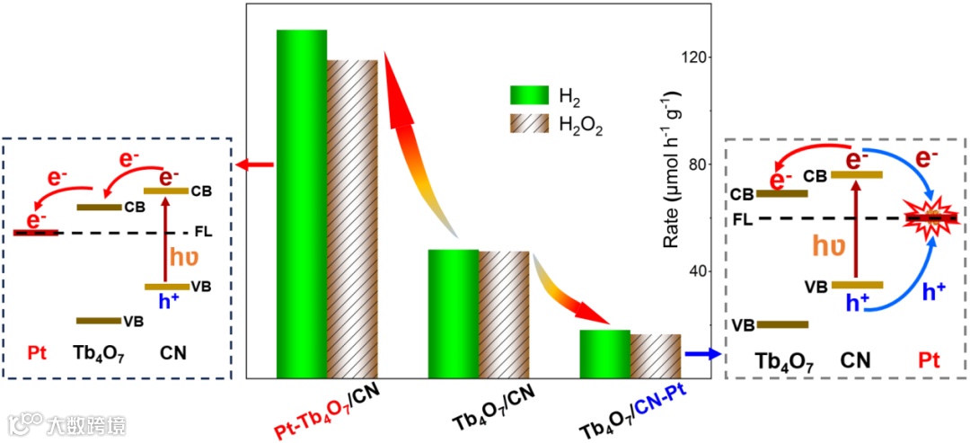 在Tb4O7/CN-Pt光催化剂的CN上负载金属Pt,虽然增强了光吸收,但也促进了光生载流子的复合,显著地降低了该催化剂的光催化全分解水性能(18.2 μmol h-1 g-1)。相比初始材料Tb4O7/CN光催化活性,降低2.6倍(见图7)。