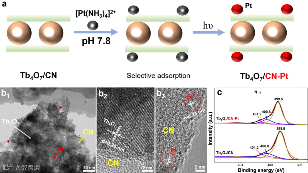 图4. (a) Tb4O7/CN-Pt光催化制备流程示意图,Tb4O7/CN-Pt光催化剂TEM图片 (b1)、HRTEM图片 (b2-b3),(c) Tb4O7/CN和Tb4O7/CN-Pt光催化剂的N1s轨道XPS图谱。