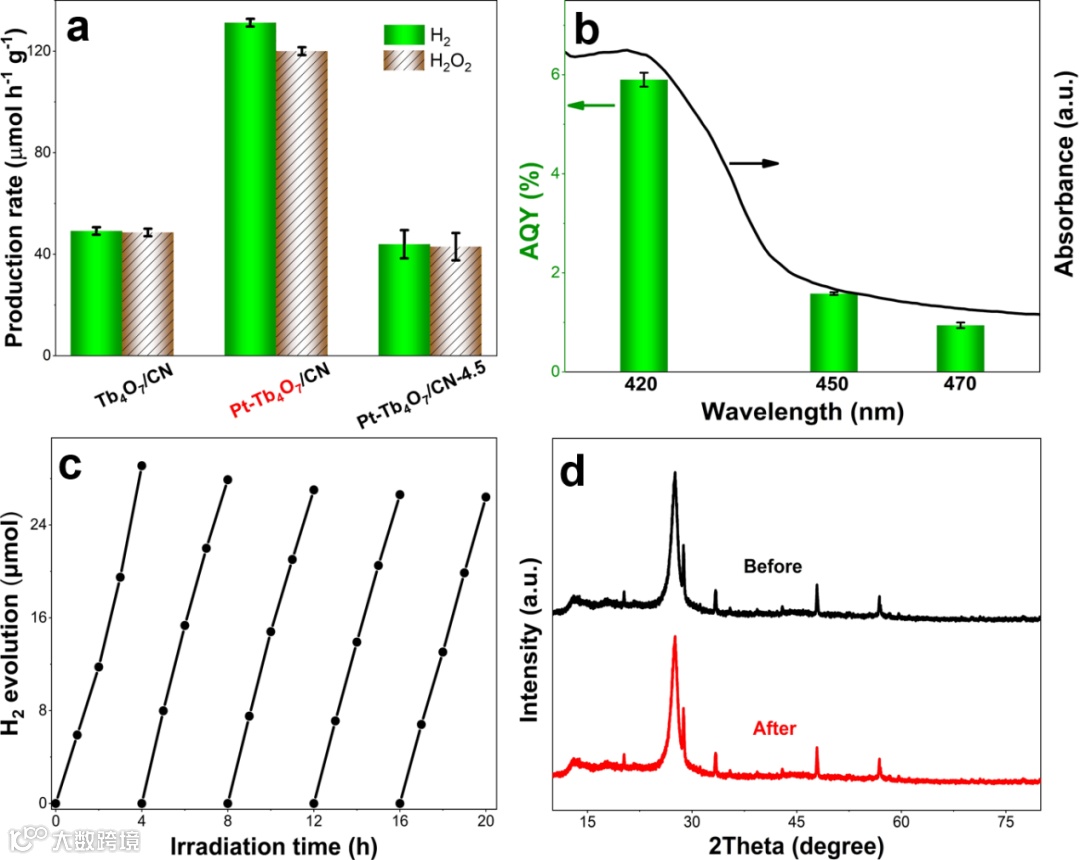 Pt选择性负载Tb4O7/CN异质结中Tb4O7上(Pt-Tb4O7/CN),产H2速率高达132 μmol h-1 g-1,比初始材料Tb4O7/CN(48 μmol h-1 g-1)活性提高了2.8倍(图6a)。Pt-Tb4O7/CN表观量子产率随光谱吸收波长增长迅速下降的趋势说明光照是全分解水反应的驱动力(图6b)。5个周期总共20个小时的循环实验和反应前后XRD表征证明Pt-Tb4O7/CN的稳定性(图6c和图6d)。