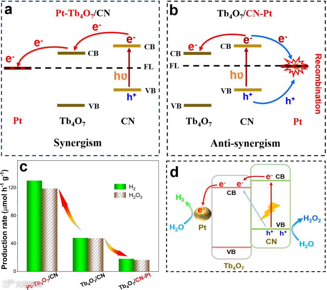 图8. (a)Pt-Tb4O7/CN光催化剂中协同促进电荷跃迁示意图,(b)Tb4O7/CN-Pt催化剂中反协同效应电子跃迁示意图,(c)Pt-Tb4O7/CN、Tb4O7/CN和Tb4O7/CN-Pt催化剂全分解水活性比较,(d)Pt-Tb4O7/CN催化剂光催化全分解水反应机理图