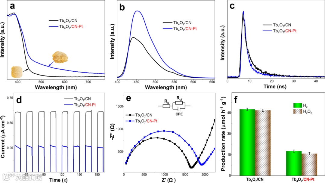 图7. Tb4O7/CN和Tb4O7/CN-Pt光催化剂的紫外可见漫反射光谱图 (a),光致荧光发光光图谱 (b),时间分辨荧光衰减寿命曲线图 (c),瞬态光电流密度曲线图 (d),电化学阻抗图谱 (e),光催化全分解水活性图 (f)。