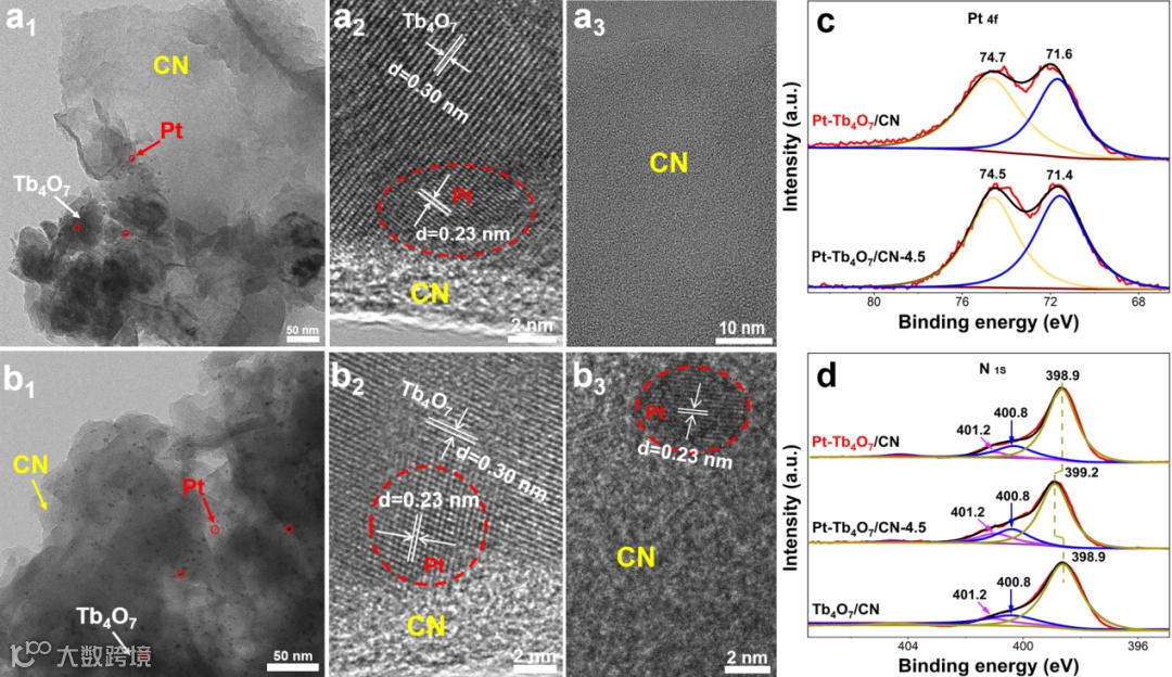 图3. Pt-Tb4O7/CN光催化剂的TEM图片 (a1)、HRTEM图片 (a2-a3),Pt-Tb4O7/CN-4.5光催化剂的TEM图片 (b1)、HRTEM图片 (b2-b3),(c) Pt-Tb4O7/CN和Pt-Tb4O7/CN-4.5催化剂的Pt4f轨道XPS图谱,(d) Tb4O7/CN、Pt-Tb4O7/CN-4.5和Pt-Tb4O7/CN催化剂的N1s轨道XPS图谱。